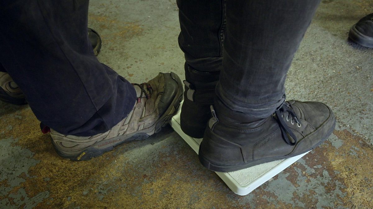 Titch, John and Billy weigh themselves at The Speedshop - Titch is suspiciously heavy.