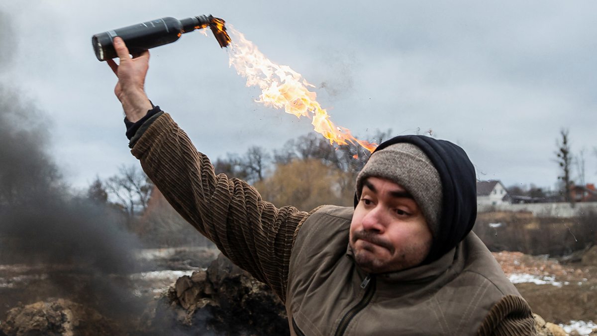 Photo: A civilian trains to throw a Molotov cocktail In Zhytomyr, Ukraine Credit: Reuters