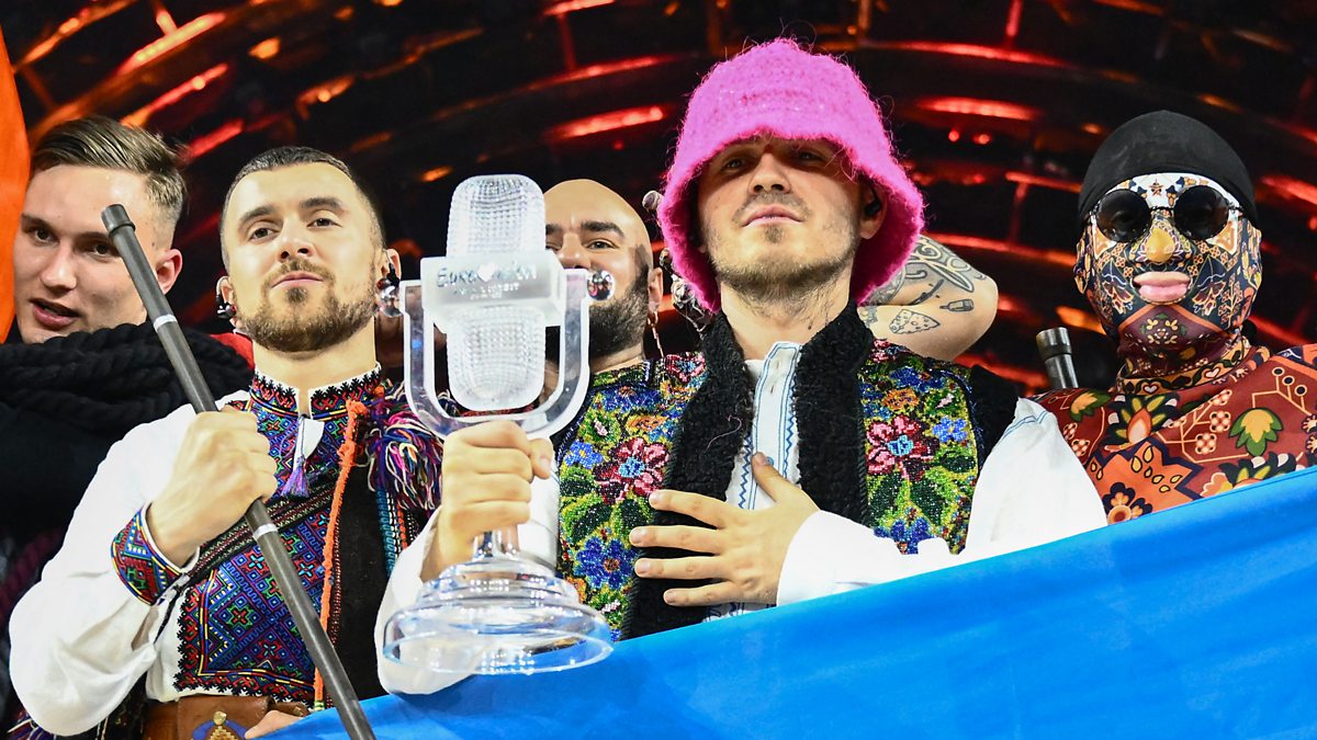 Photo: Kalush Orchestra onstage with the Eurovision winner's trophy, May 2022 Credit: Getty Images