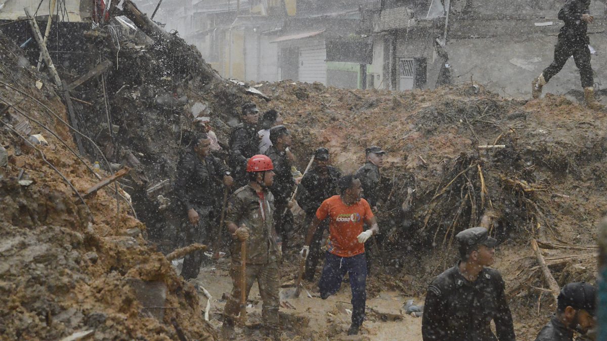 Photo: Firefighters, army soldiers and volunteers work in the area of a landslide caused by heavy rains in Pernambuco state in north-eastern Brazil Credit: EPA