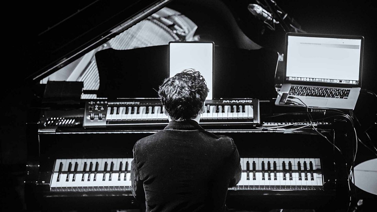 (Photo: Zubin Kanga composing a piece of music on a piano. Credit: Rachael Barrett)