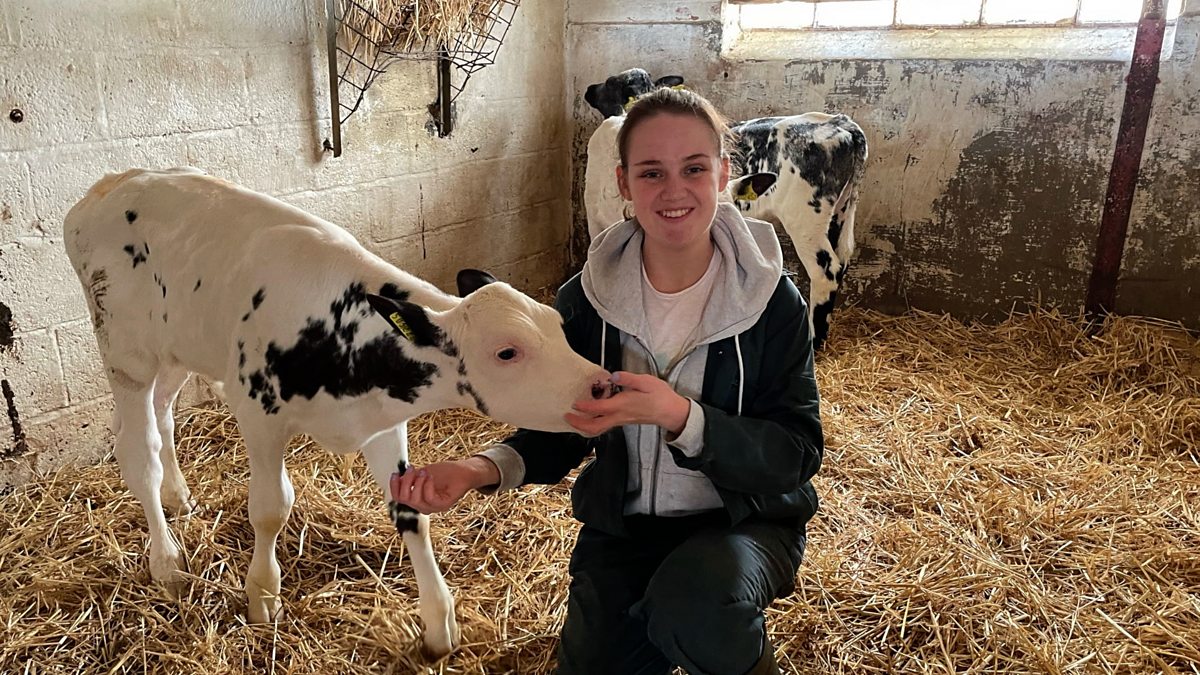 Bridgette Baker introduces Anna to the farm’s new British Blue calves.