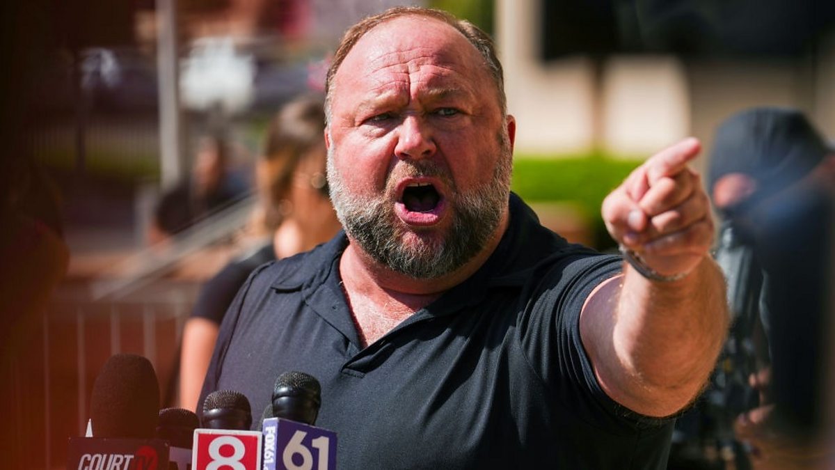 (Photo: InfoWars founder Alex Jones speaks to the media outside Waterbury Superior Court during his trial on September 21, 2022 in Waterbury, Connecticut. Credit: Joe Buglewicz/Getty Images)