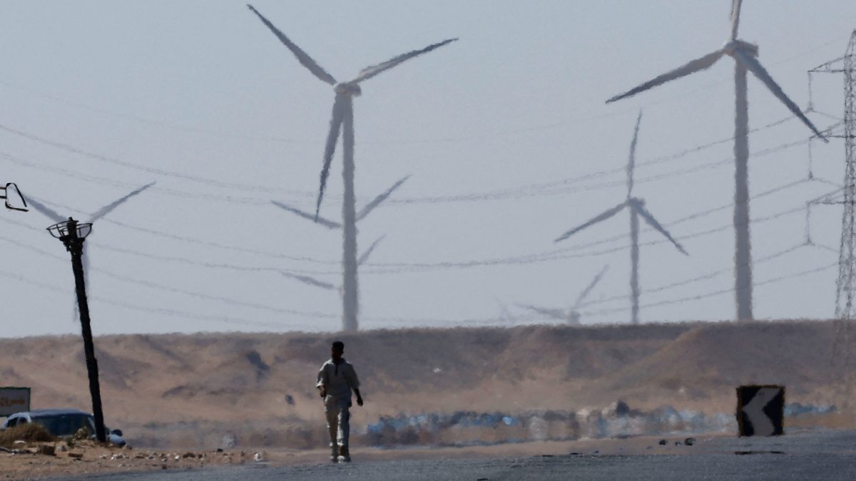 (Photo: A man walks in front of windmills at the onshore Zaafarana windfarm along the gulf of Suez on Egypt's Red Sea coast. Credit: Khaled Desouki via Getty Images)