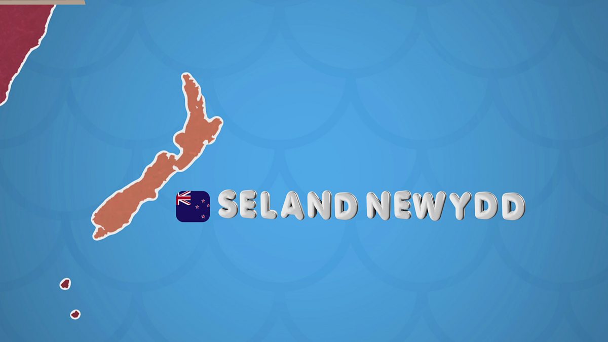 Y tro hwn: Seland Newydd. Yma byddwn ni'n ymweld â'r brifddinas Wellington, yn dysgu am y bobl Maori, ac yn edrych ar symbolau cenedlaethol fel yr aderyn ciwi. We take a trip to New Zealand.