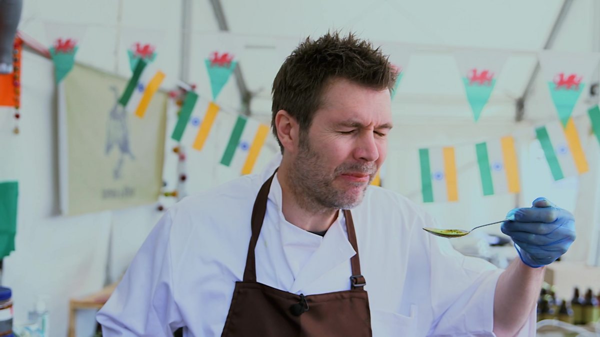 Rhod cooks a not so quick curry at food festival in Cowbridge.