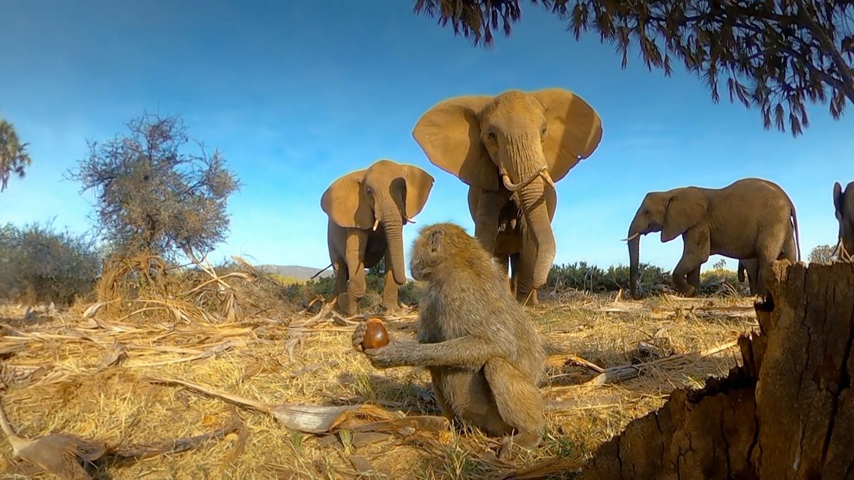 Elephants steal palm nuts from cheeky baboons