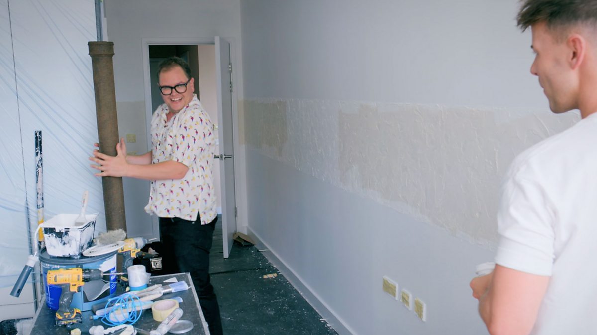 Alan sees Peter’s Ibiza themed bedroom and is intrigued by his minimalist design and rusty drain pipe! Is Peter doing enough to impress the judges?
