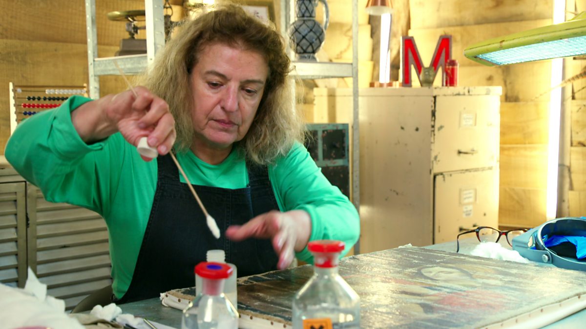 In order to bring back its modeling, Lucia carefully removes dirt and varnish from a 19th-century Ukrainian painting.