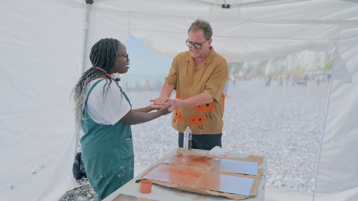 Alan sees Temi's sore hands and offers to help out distressing some copper mirrors. Will the judges be dazzled or is it a cop out?