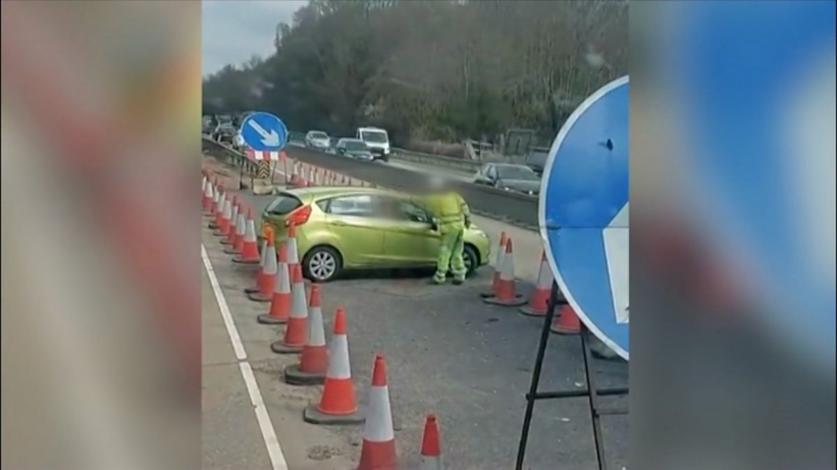 A female motorist was then seen getting out of her car, moving two lines of traffic cones out of the way before trying to cross and join a lane of moving traffic. She was prevented from joining the other lane by a highways worker.
