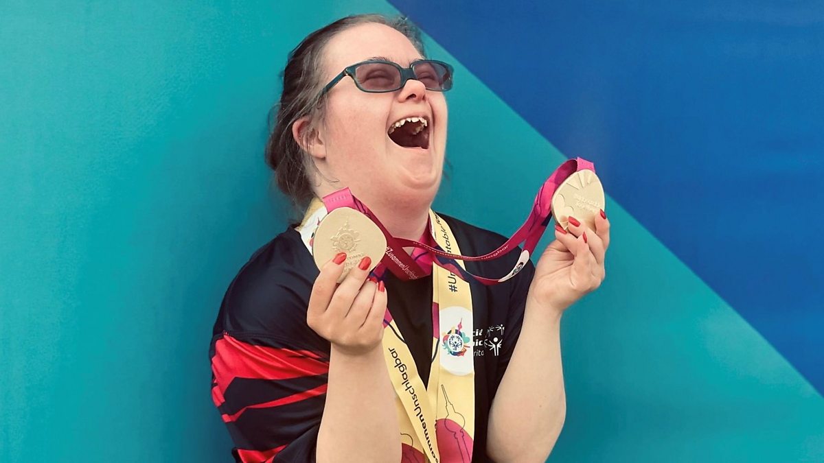 Rhythmic gymnast Ellie-Bea Thomas is celebrating after winning two gold medals in Berlin.