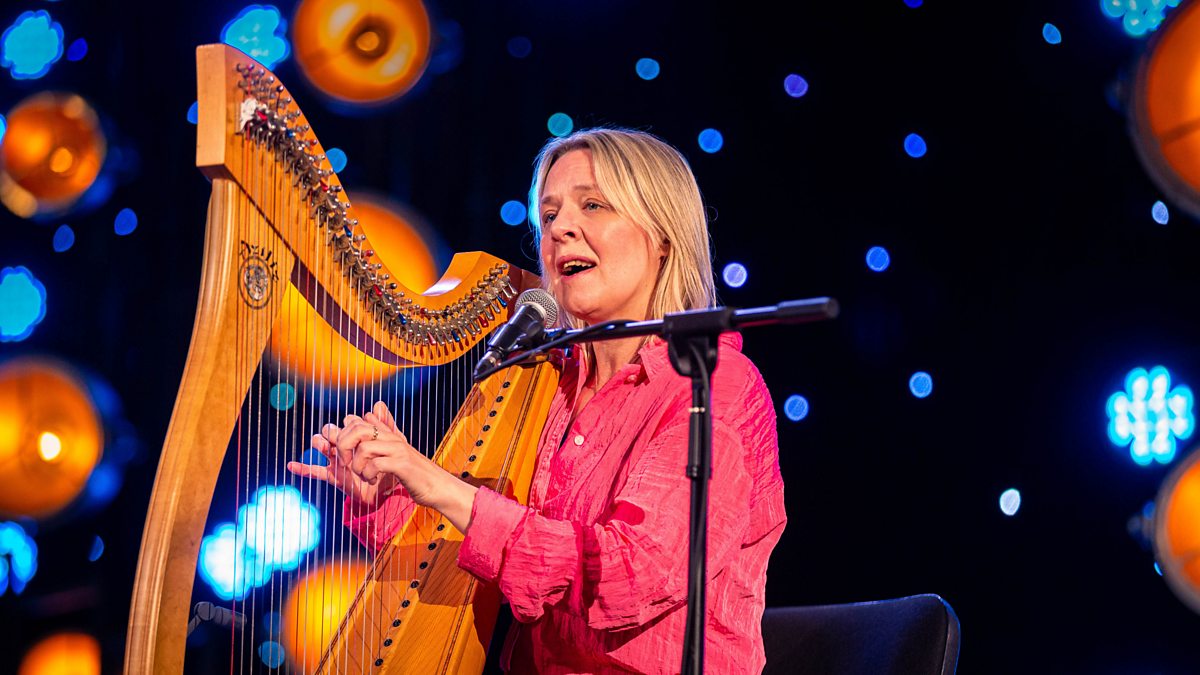 Pat Jones sy'n arwain yr emynau o Bafiliwn Eisteddfod Genedlaethol Llyn ac Eifionydd. The Sunday service will be under the care of our local voices with the Gymanfa Choir and audience.