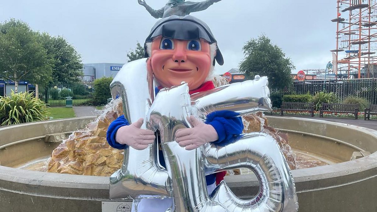 Skegness icon, Jolly, celebrates his birthday with balloons and reporter Grace McGrory.