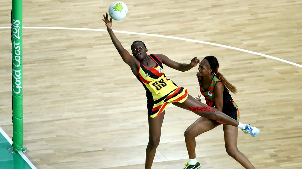 Photo: Proscovia Peace of Uganda (L) and Ngwira Loreen of Malawi (R) compete in the Netball match between Uganda and Malawi on day three of the Gold Coast 2018 Commonwealth Games (Credit: Phil Walter/Getty Images)