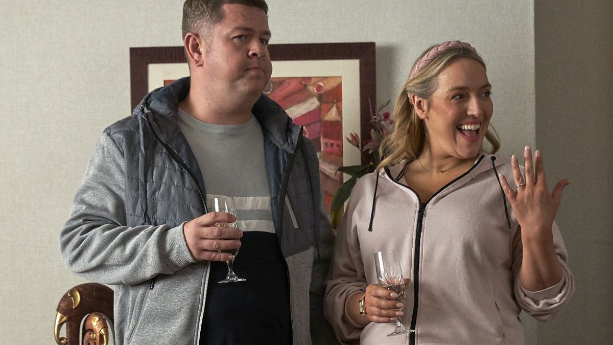 Cathy and Colin bring a bottle of bubbly to celebrate the big news.