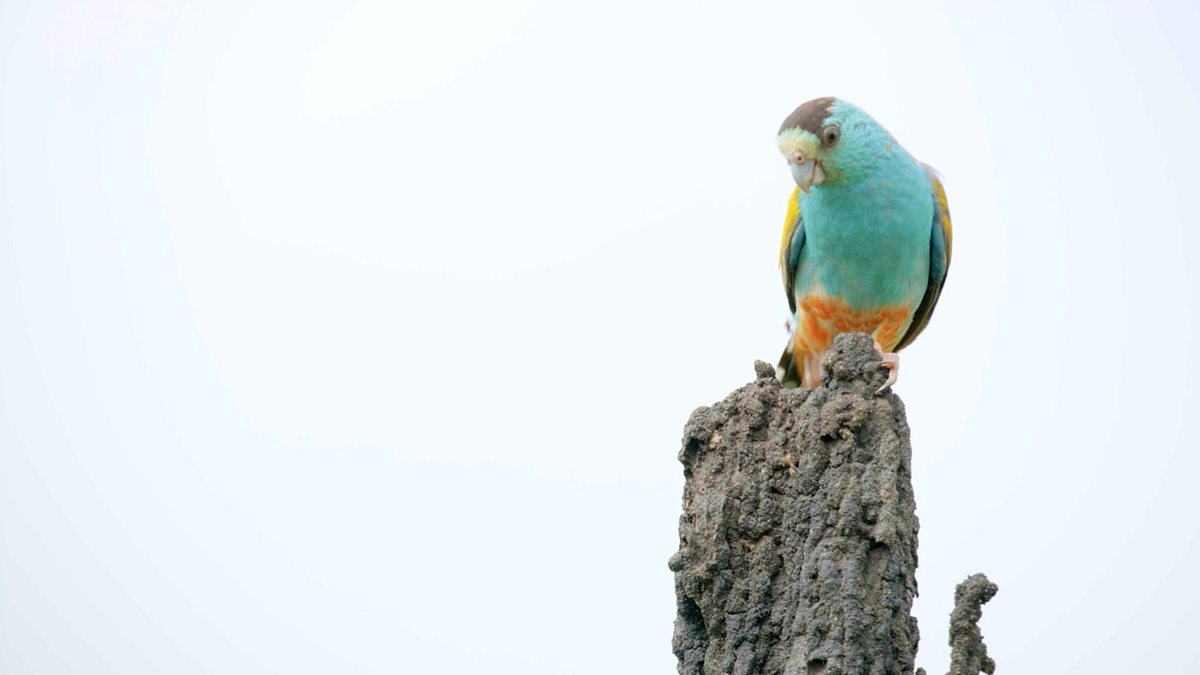 A male golden-shouldered parrot tries to defend his nest from meat ants in Australia.