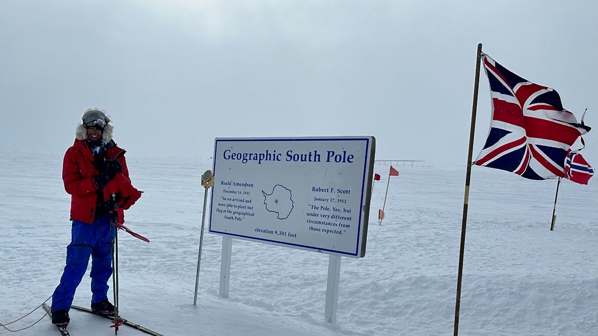Image: Preet Chandi reaches the South Pole after covering 1,130km across more than 31 days. (Credit: Preet Chandi / Sway Communications)