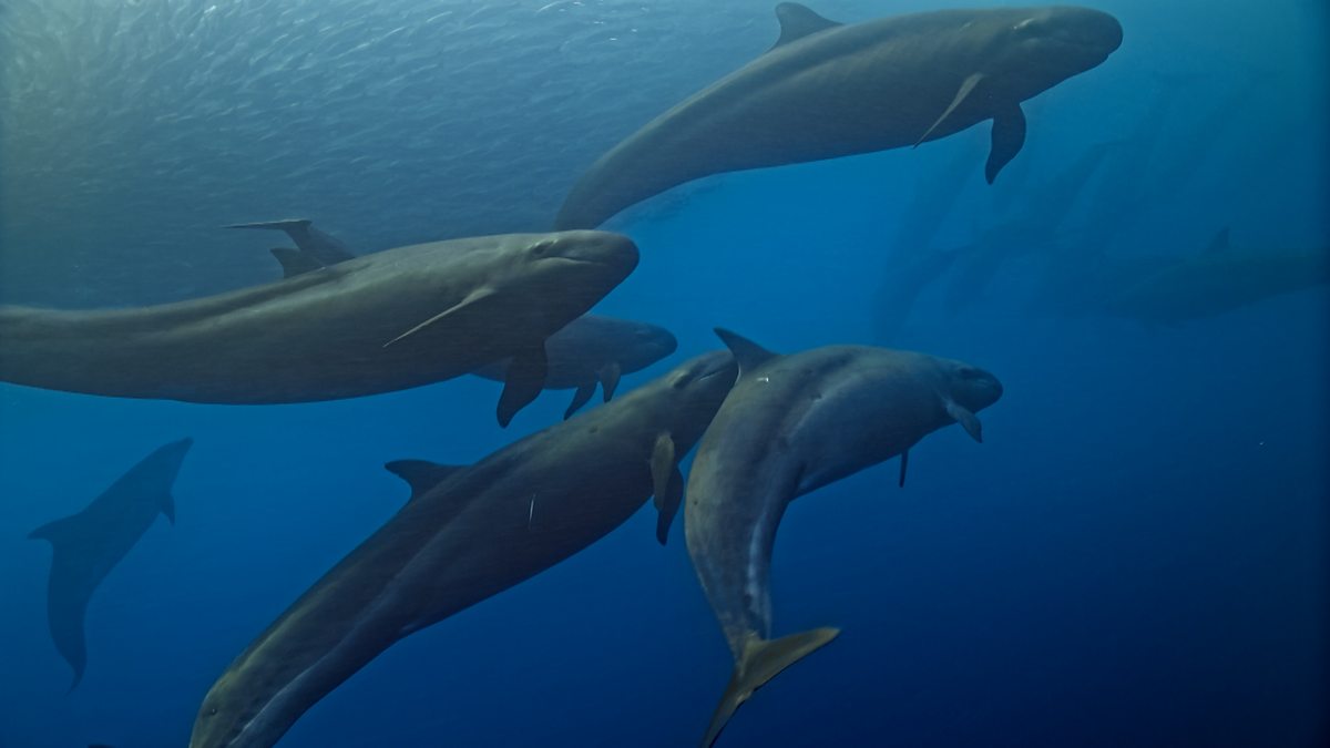 False killer whales and bottlenose dolphins hunt together off the coast of New Zealand.