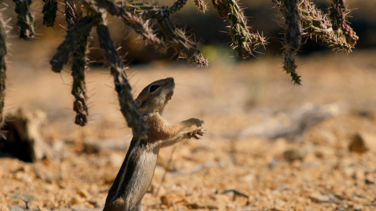 Harris's antelope squirrel clambers over painful cholla cactus spines to get its fruit.