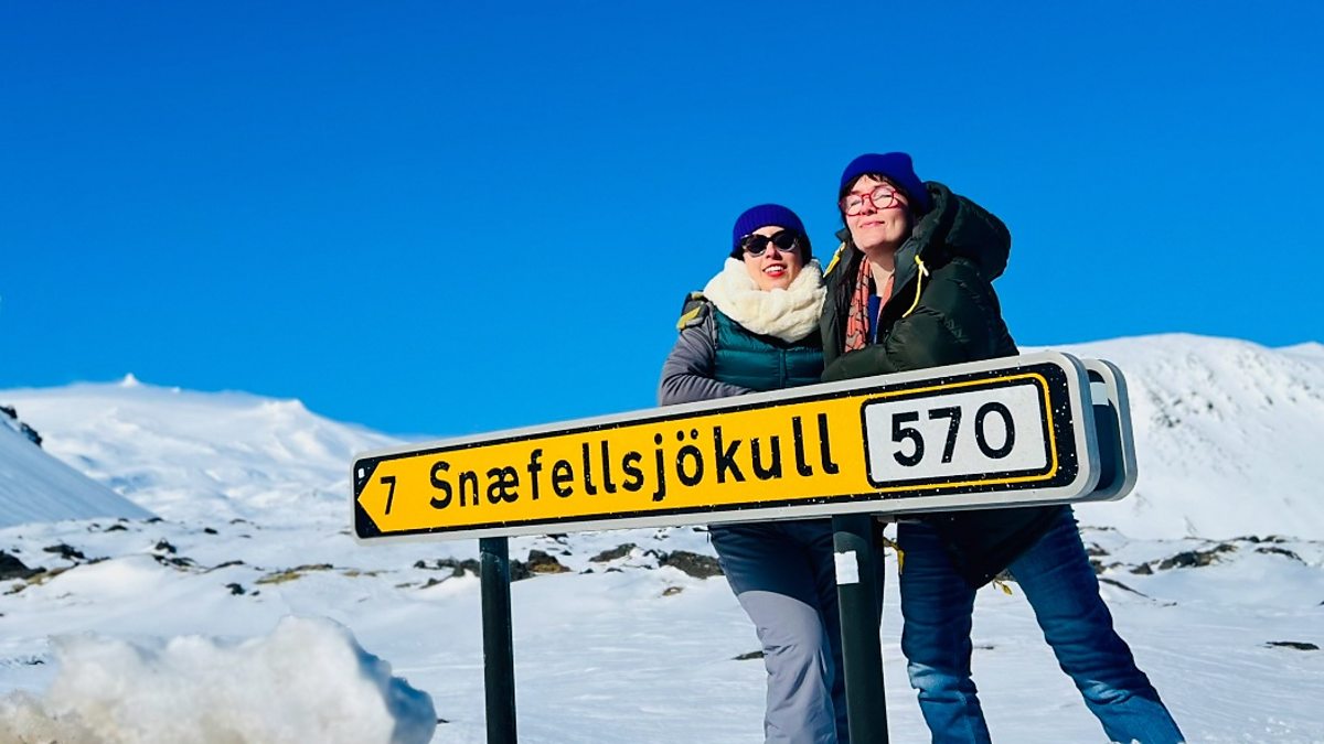 (Image: Campaigners standing next to a sign for the Snæfellsjökul glacier. Credit: Snæfellsjökul fyrir forseta)
