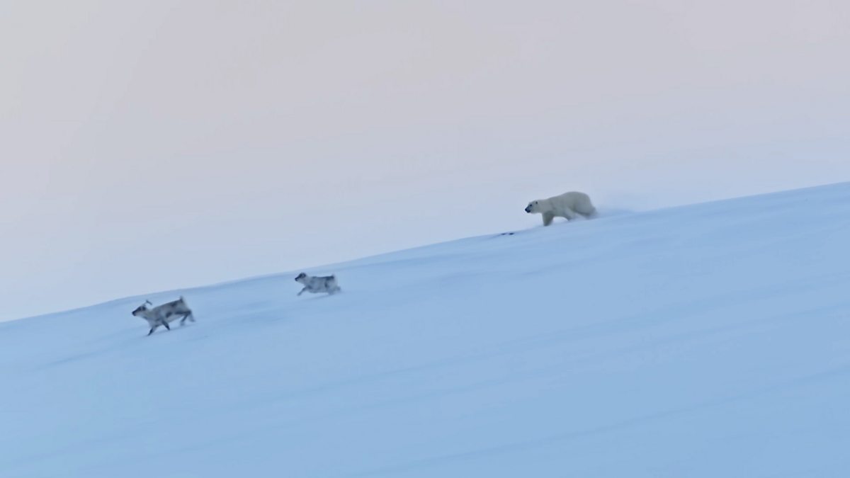 A polar bear hunts reindeer