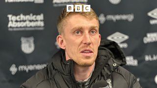 Jaze Kabia reacts to reaching 15 goals in his debut season for Grimsby Town.