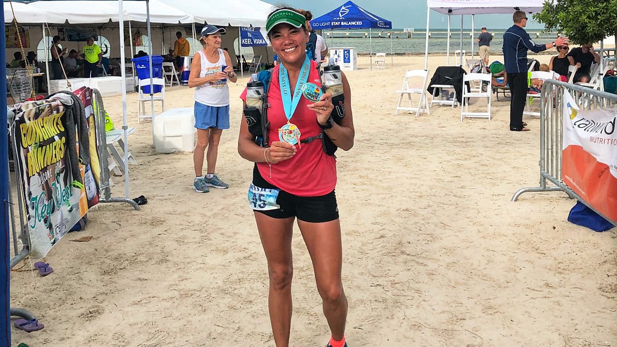 Image: Susie Chan holding one of her many race medals at the finish line of an endurance race. (Photo courtesy of Susie Chan)