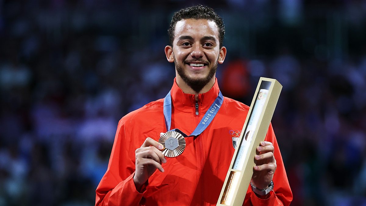 Photo: Bronze medallist Mohamed Elsayed of Team Egypt celebrates on the podium during the Men's Épée medal ceremony on day two of the Olympic Games Paris 2024 at Grand Palais on July 28, 2024 in Paris, France. (Credit: Getty Images)