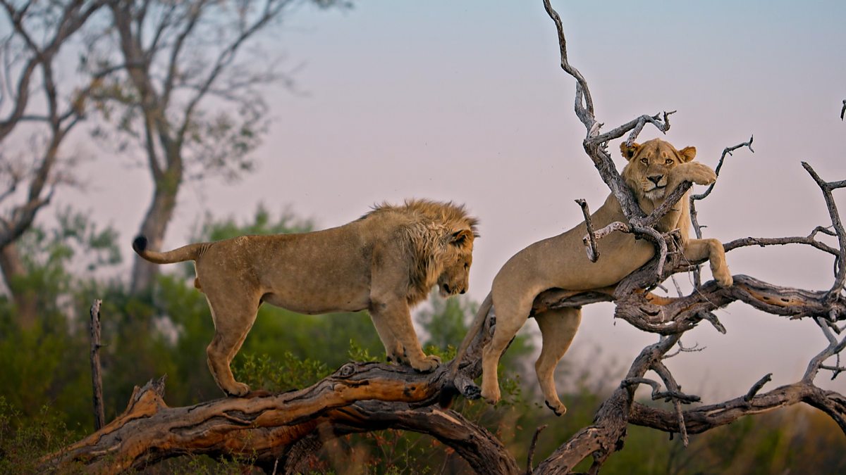 Sub-adult male lions Colin and Nkgonne try to relax, balanced on the branches of a tree.