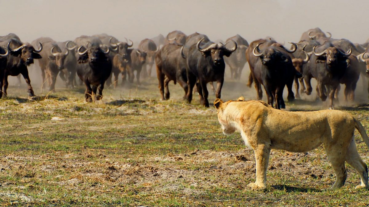 The lion cubs are forced to swim for their lives after being chased by a herd of buffalo.