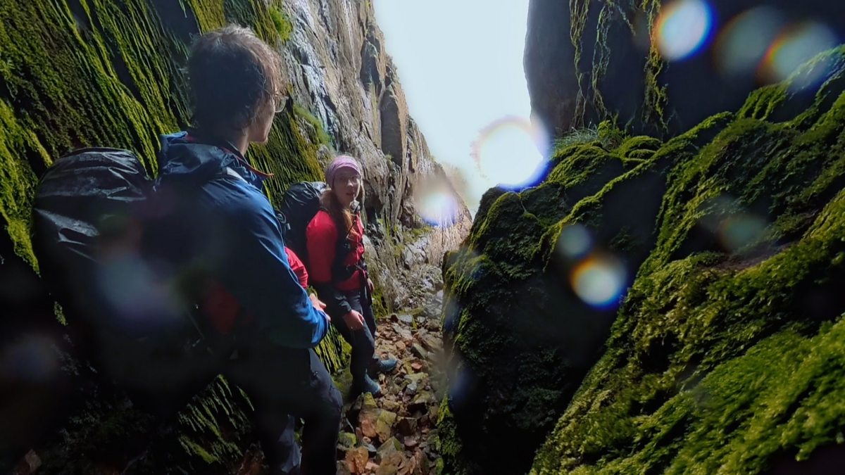 Anna and Mat start to climb Dow Crag after a bout of rain. But without safety ropes, it proves a much harder task.