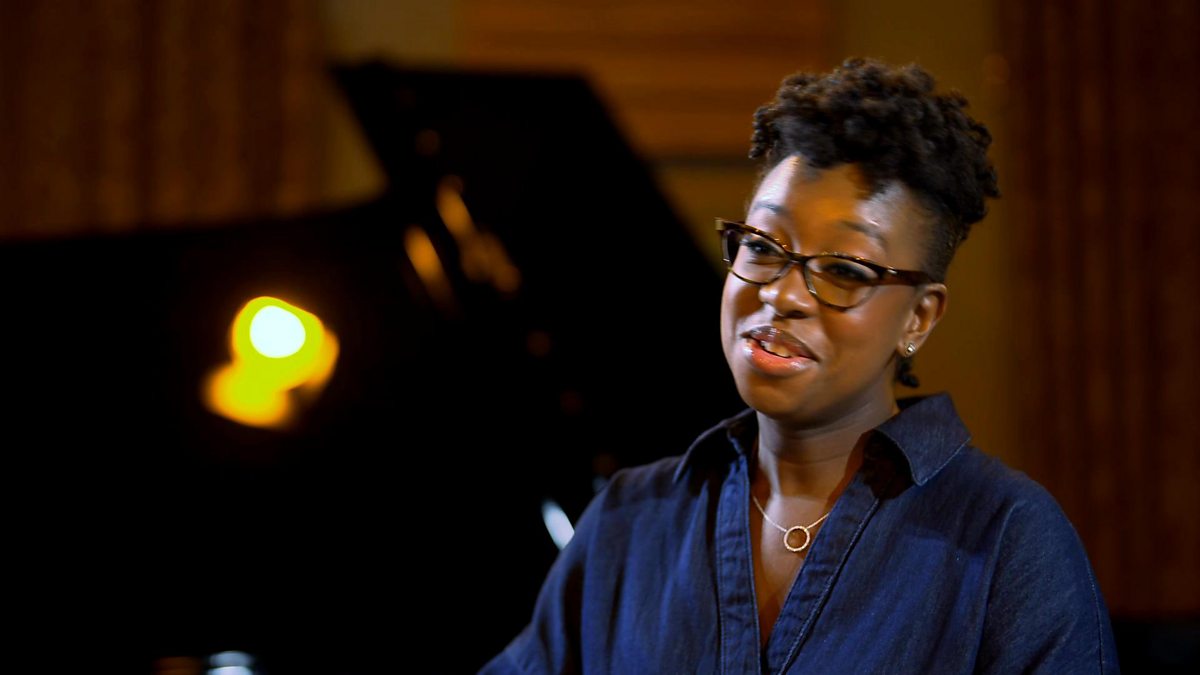 Aled Jones takes a turn playing the saxophone under the careful tuition of YolanDa Brown.