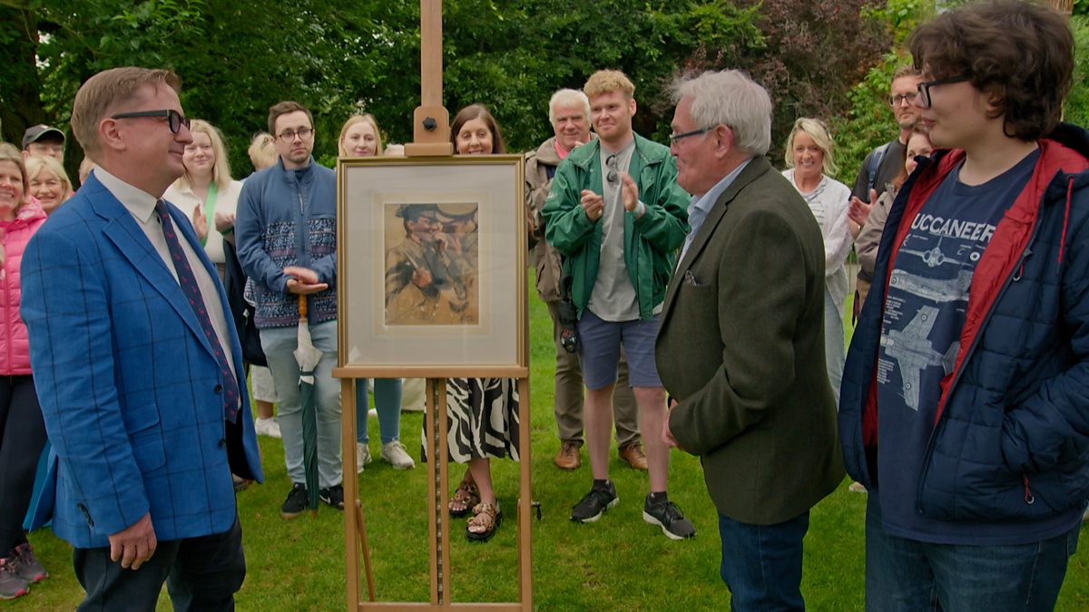 Grant Ford appraises a coloured crayon drawing by Belfast artist William Connor