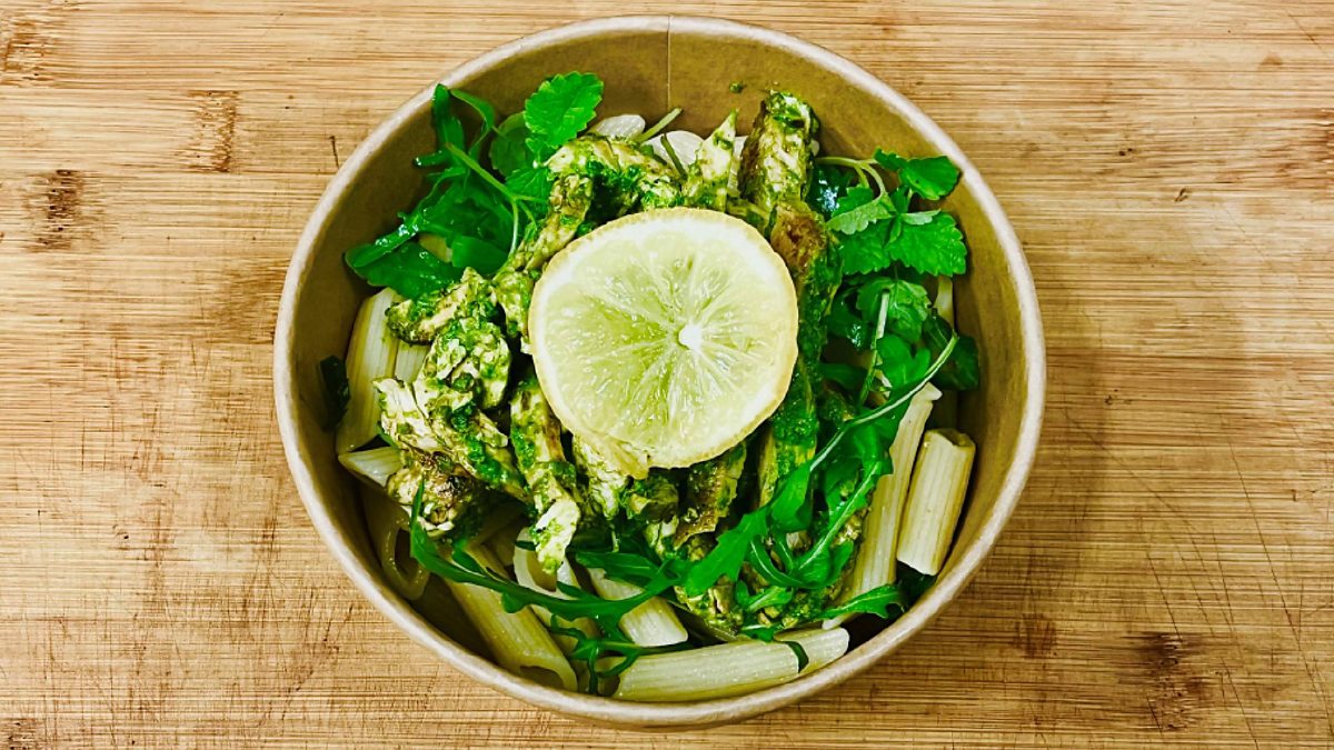 Protein packed chicken, pesto & pasta salad