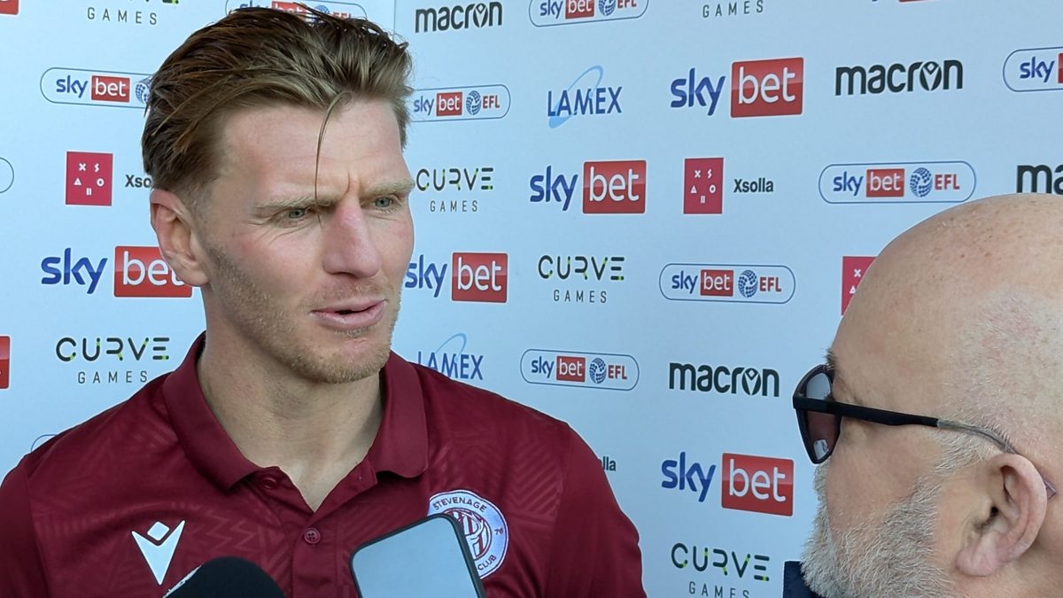 Stevenage defender Carl Piergianni reacts after winning 3-1 against Crawley Town.