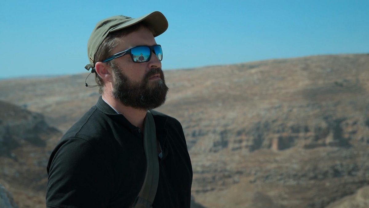 As settler Ari Abramowitz surveys the land, Louis asks about the Palestinians’ connection to it.