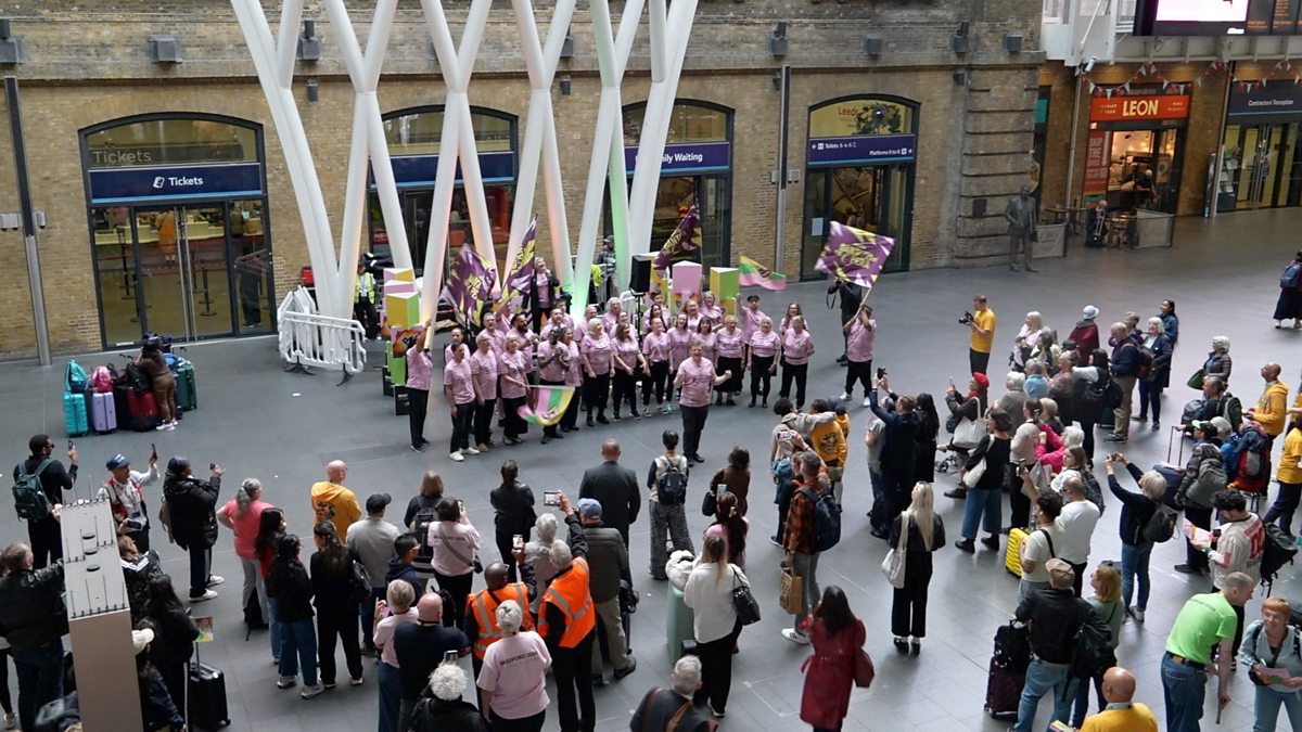 The choir made up of 50 Bradford City fans performed in a packed out King's Cross station. They travelled down from Bradford to mark the increase in train services to London. The choir performed for passengers onboard before arriving in the capital.
