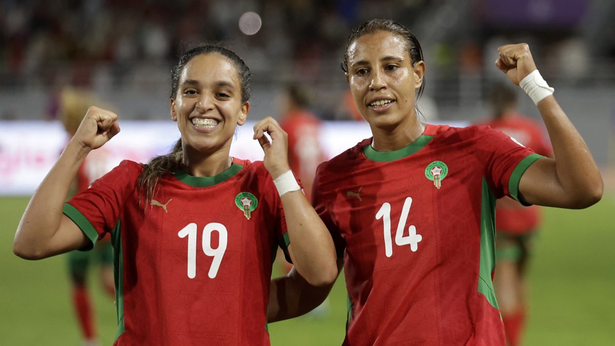 Image: Morocco's forward #19 Sakina Ouzraoui celebrates with defender #14 Aziza Rabbah after scoring her team's equaliser during the 2025 Women's Africa Cup of Nations semi-final football match against Ghana at Prince Moulay Abdellah Stadium in Rabat on July 22, 2025. (Photo by Abdel Majid/AFP via Getty Images)