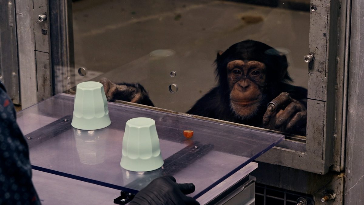 Jim Al-Khalili plays a game with the chimpanzees at Edinburgh Zoo to test their cognitive powers.