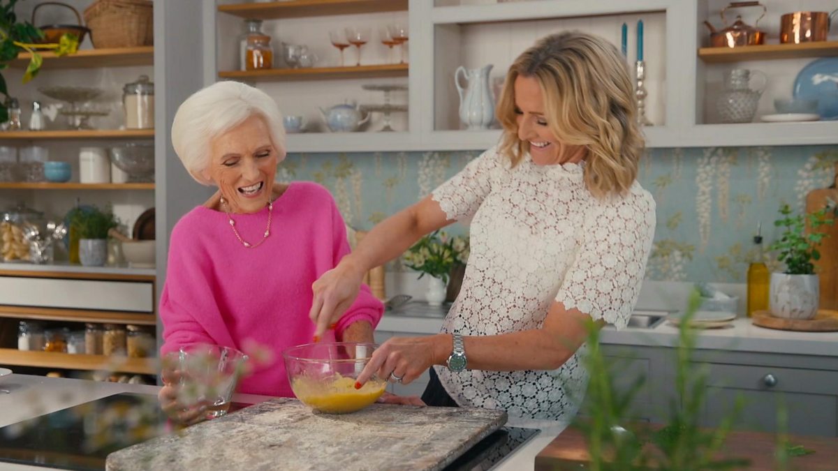 Gabby Logan suffers an egg mishap in the kitchen with Dame Mary Berry as they make the sauce for a dill-cured gravadlax.