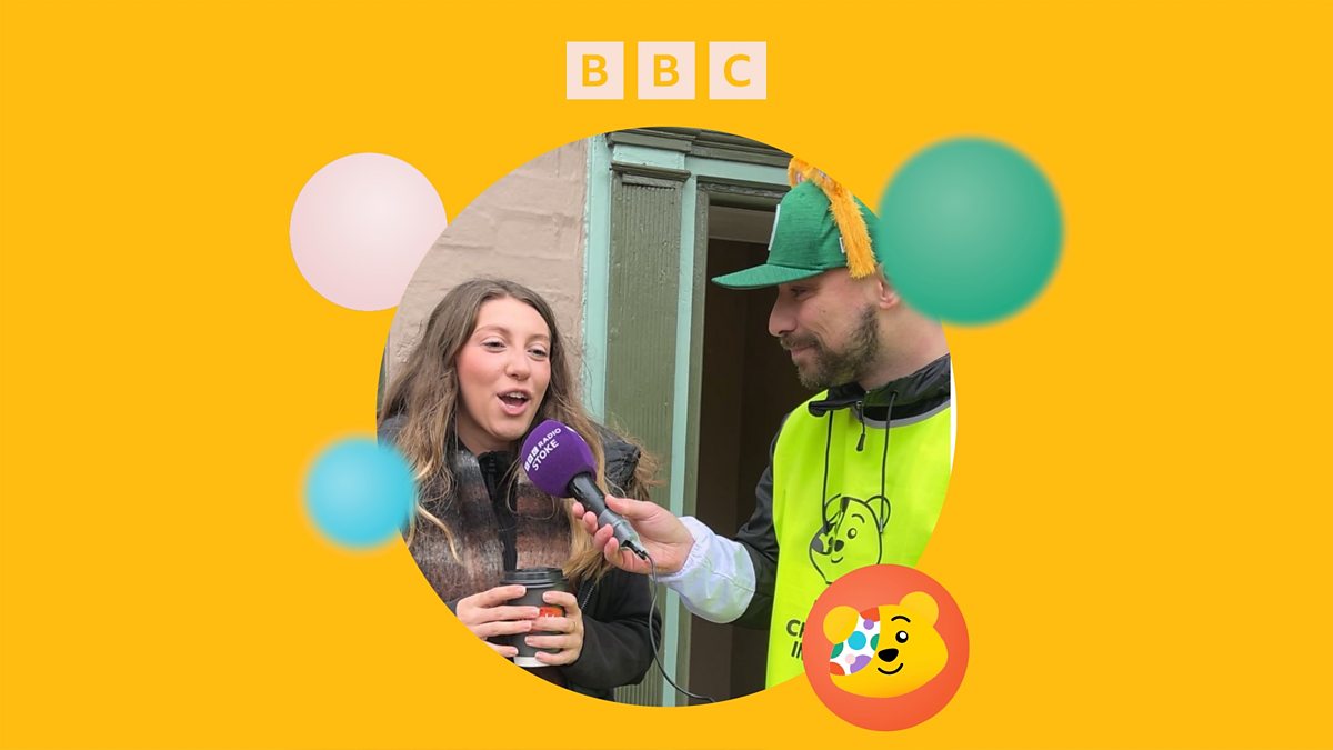 BBC Radio Stoke's Lee Blakeman makes a brief stop on his three-legged walk with Ajmal Hussain around Stoke-on-Trent, to talk to another local group who benefit from money raised by BBC Children In Need.
