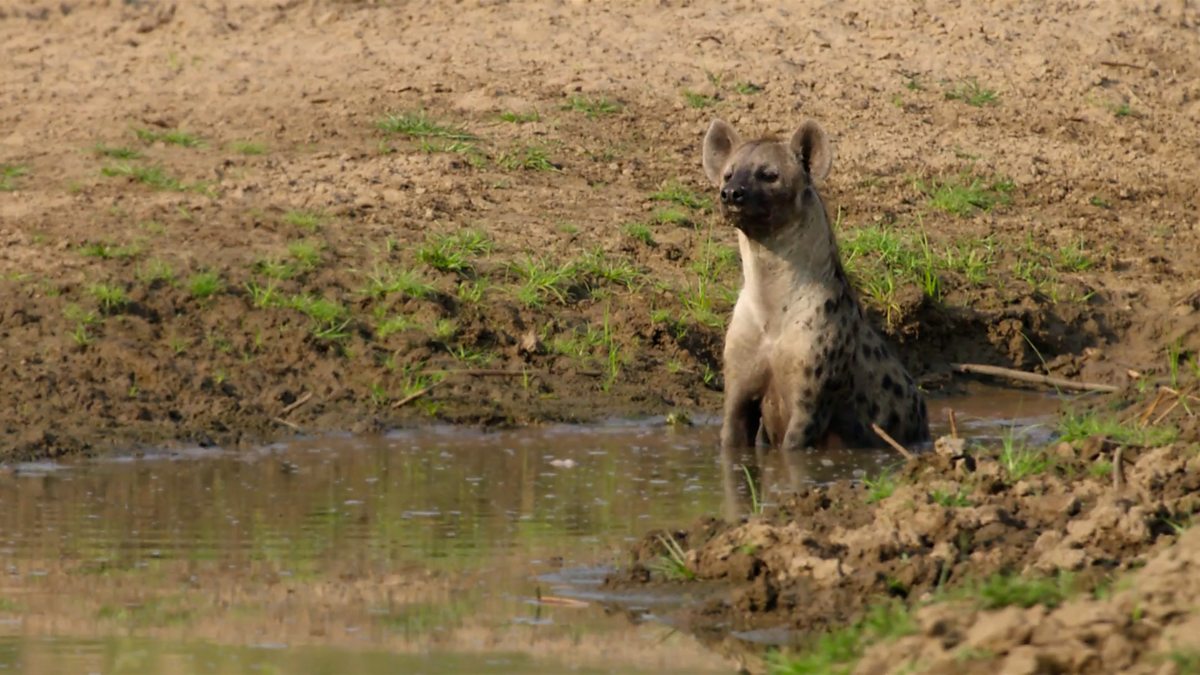 The pregnant mother hyena tries to hide her food from the rest of her pack.