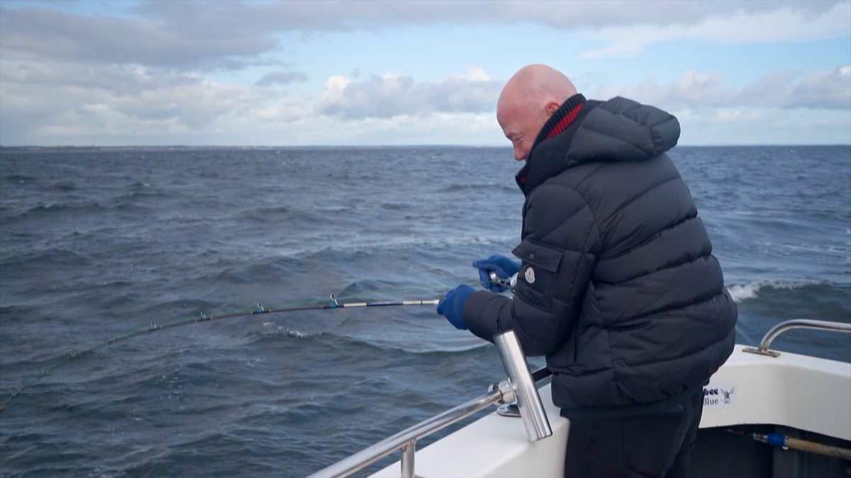 Robson can't quite believe he's out on the ocean with footballing legend Alan Shearer.
