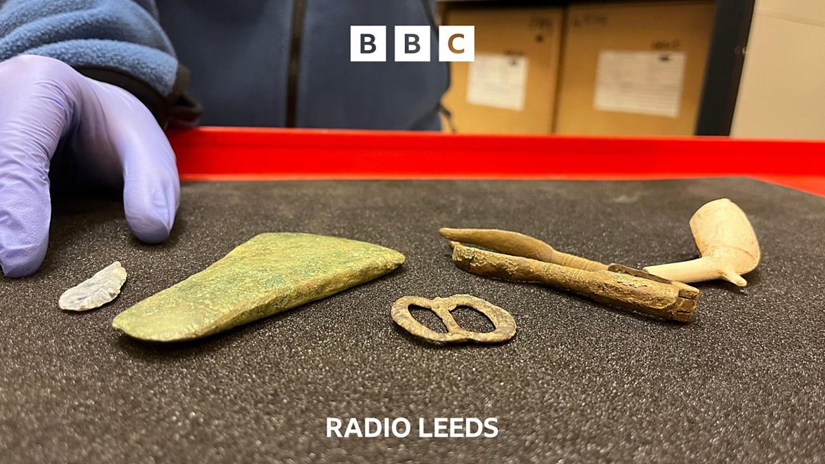 A prehistoric arrowhead, a Bronze Age axe and a 300-year-old pair of nutcrackers were among the thousands of items dug up during work on the East Leeds Orbital Route. Experts from Wessex Archaeology were commissioned to carry out detailed surveys and digs along the four-mile route to gather evidence of sites of historical significance. Wessex Archaeology said over 6,454 items were discovered in total, with a Neolithic leaf-shaped arrowhead dating back about 6,000 years.