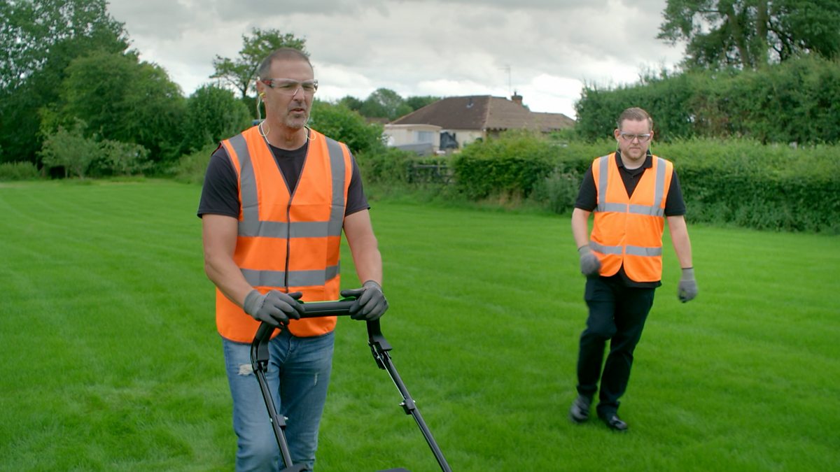 Paddy tests out a mower on a lawn and discovers the best height to cut the grass for good-looking stripes.