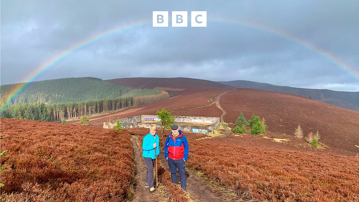Stewart begins today’s walk at Innerleithen Parish Church on Leithen Road. From there he then leads Clare over Leithen Water at Cuddy Bridge and, after a couple of stiff climbs through a forestry plantation with trees creaking in the wind, arrives at the disused relic of Kirnie Law reservoir. It's a great view point, which thanks to the rainy, sunny, sleety weather, created a full rainbow over the heathery hills beyond. It's a circular route that takes them back down to Innerleithen, just over five miles in total.