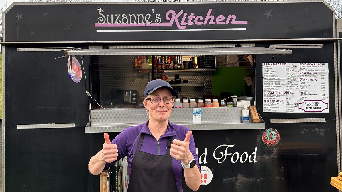 Mae Sue Morris yn rhedeg caban bwyd ar ochr yr A55 ers ychydig dros flwyddyn ac mae'n cael cyfle i sgwrsio efo gyrrwyr lori o bob rhan o Ewrop gan ddysgu ambell air Cymraeg iddyn nhw tra'n dysgu geiriau pwysig mewn ieithoedd fel Pwyleg a Romaneg