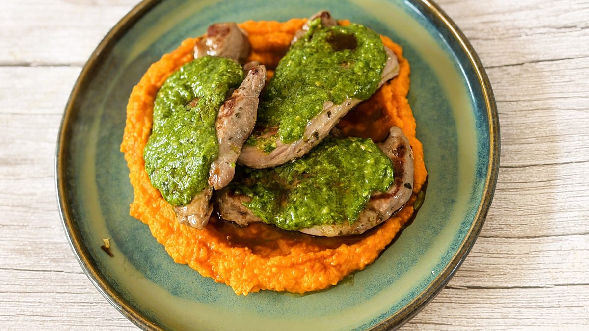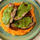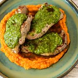 Grilled Leg Of Lamb With Wild Garlic And Almond Pesto With Carrot Skordalia