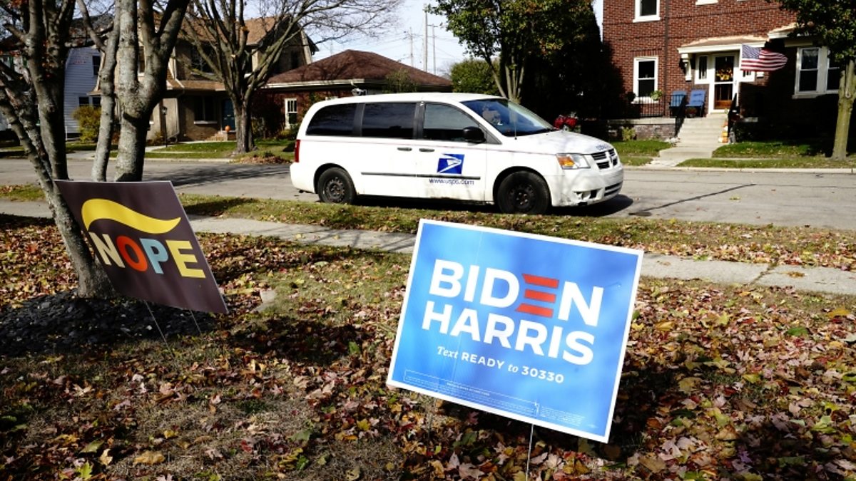 (Photo: Signs supporting Joe Biden and his running mate Kamala Harris in front of a suburban home in Racine, Wisconsin, November 2, 2020. Credit: Reuters/Bing Guan)